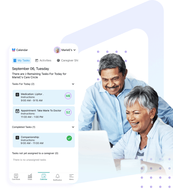 Use the main menu to access your loved one’s Needs Assessment and Calendar as well as caregiver shifts.